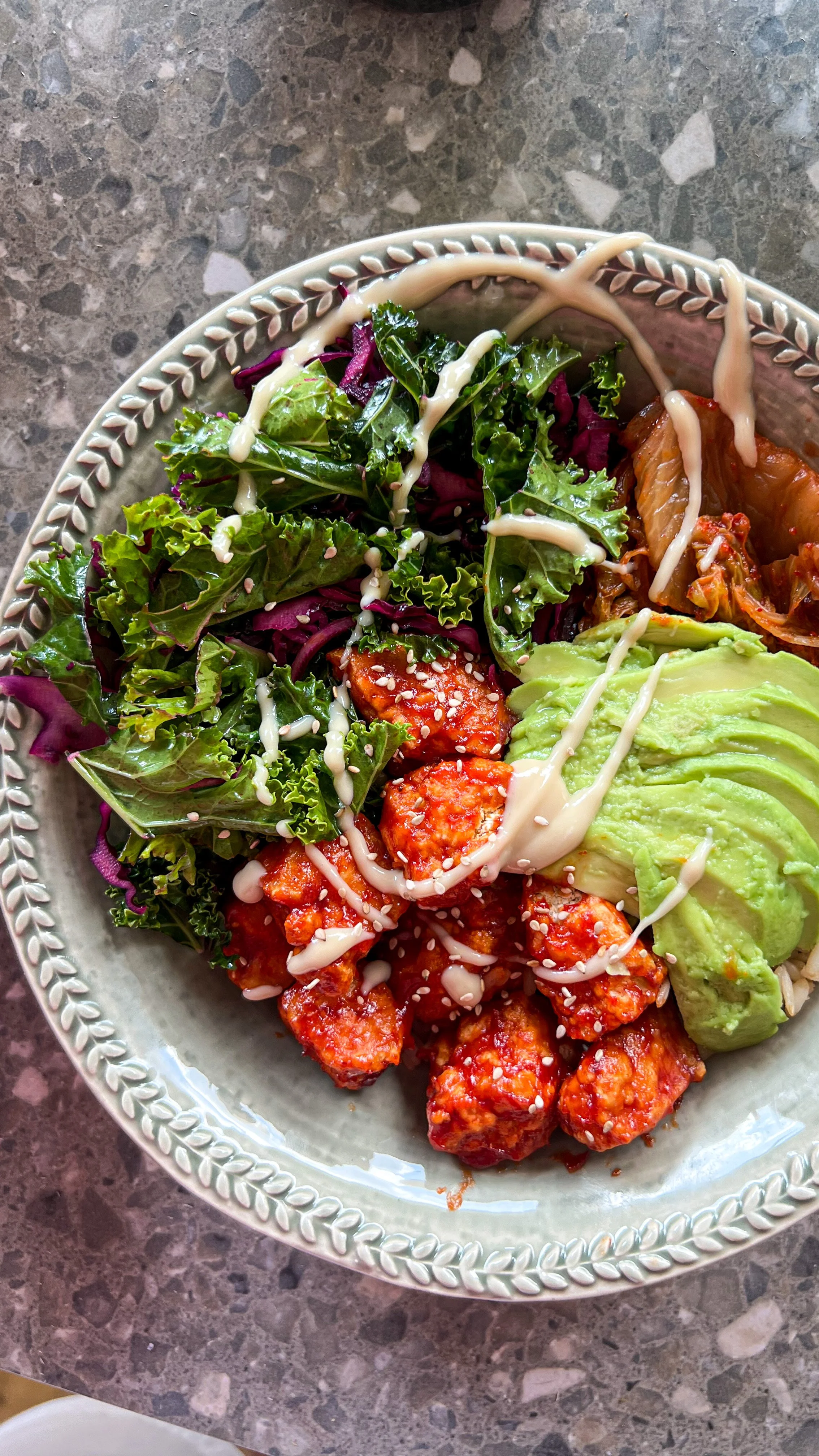 Add the rice at the bottom to the bowls, then the tofu, avocado, a bit of kimchi, kale and red cabbage, and finish with the tahini dressing.